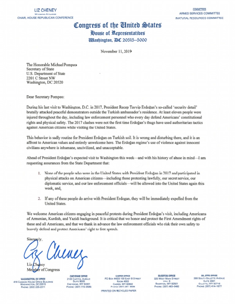 Representative liz cheney (r., wyo.) called on the state department monday to ban the bodyguards of turkish president recep tayyip erdogan who assaulted protesters in a 2017 incident in washington, d.c.