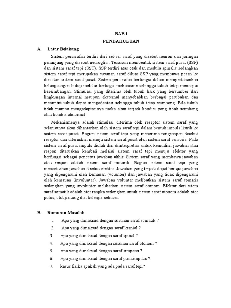 Makalah Obat Sso from imgv2-2-f.scribdassets.com Dengan kata lain, sistem saraf berperan dalam pengontrolan tubuh manusia. Makalah sistem saraf bab i. Sistem saraf dibagi menjadi dua, yaitu sitem saraf pusat dan sistem saraf perifer. Siste m ini meliputi sistem saraf pusat dan sistem saraf tepi. Makalah anatomi fisiologi manusia sistem saraf manusia disusun oleh : Denyut jantung, pernafasan, pencernaan, dan urinaria dikontrol oleh sistem saraf. Oleh karena itu, secara garis besar di dalam makalah ini, penulis akan membahas bagaimana sistem saraf pada hewan invertebrata. 151.140.0071 kelas :1 / c jurusan pendidikan ipa biologi fakultas ilmu tarbiyah dan keguruan (fitk) institut agama islam negeri (iain) mataram 2014 kata pengantar puji syukur kami panjatkan kehadirat allah swt, karena…
